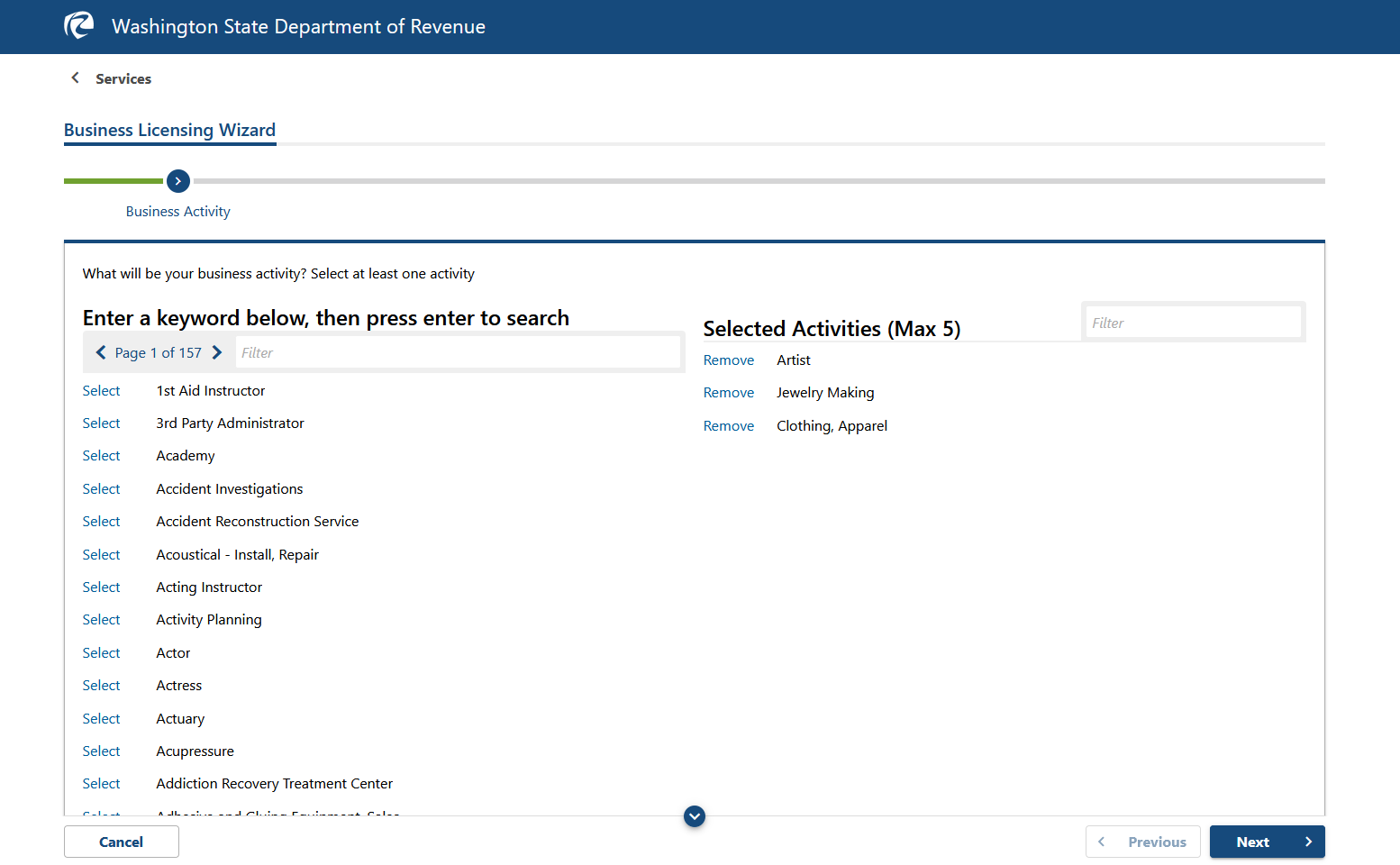 And, well. Start a scenario. It will help you figure out the right vocabulary to use when you do apply for your businesses. For example, I chose Artist, Jewelry Making, Clothing Apparel.