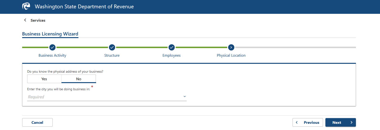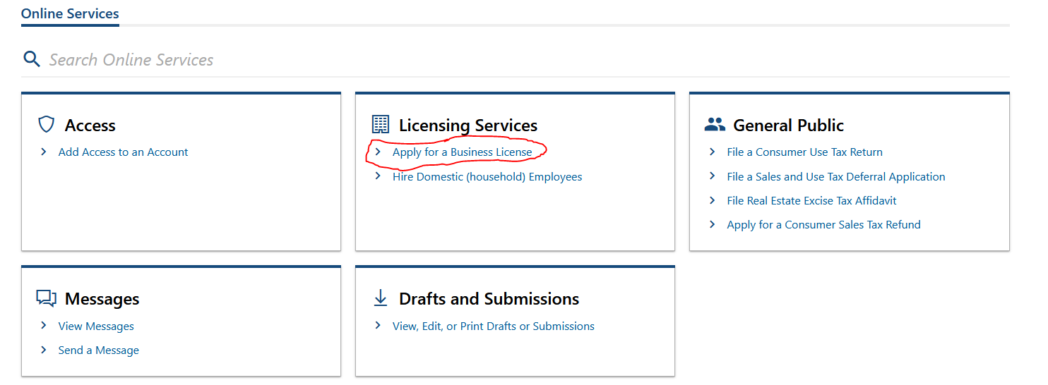 We’re going back to Department of Revenue (DOR), setting up an account if we haven’t already and will be selecting “Apply for a Business License” upon the login dashboard.